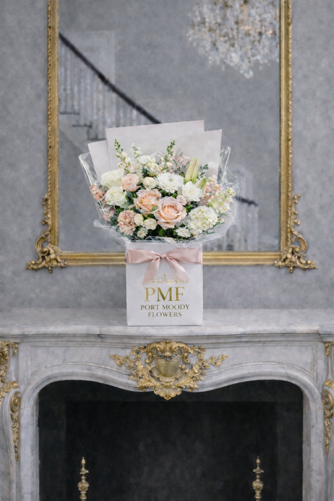 Our Fresh Floral Bouquet collection arrive as a hand tied bouquet with a water pouch and are beautifully gift wrapped with a box. A vase is not included.